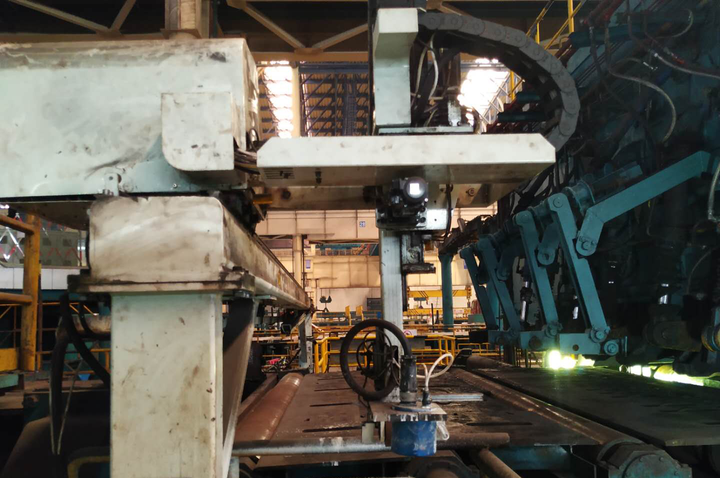 划线喷号一体机在定尺剪前,平行于辊道设置多根立柱,立柱之间上有横梁连接,形成一个吊装滑行轨道,轨道上安装齿轮齿条传动,喷印小车在吊装轨道上滑行,不影响辊道电机的吊装更换。